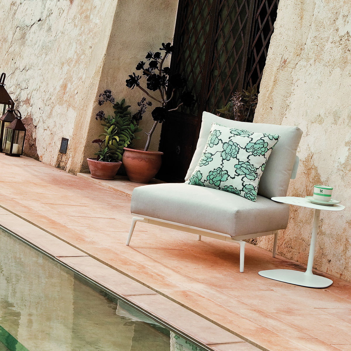 Le fauteuil Aikana de Fast par Weishäupl est adapté tant pour un usage à l'intérieur qu'à l'extérieur. Il peut être livré avec ou sans accoudoirs et est constitué d'un châssis en aluminium revêtu par poudre et d'un capitonnage imperméable.