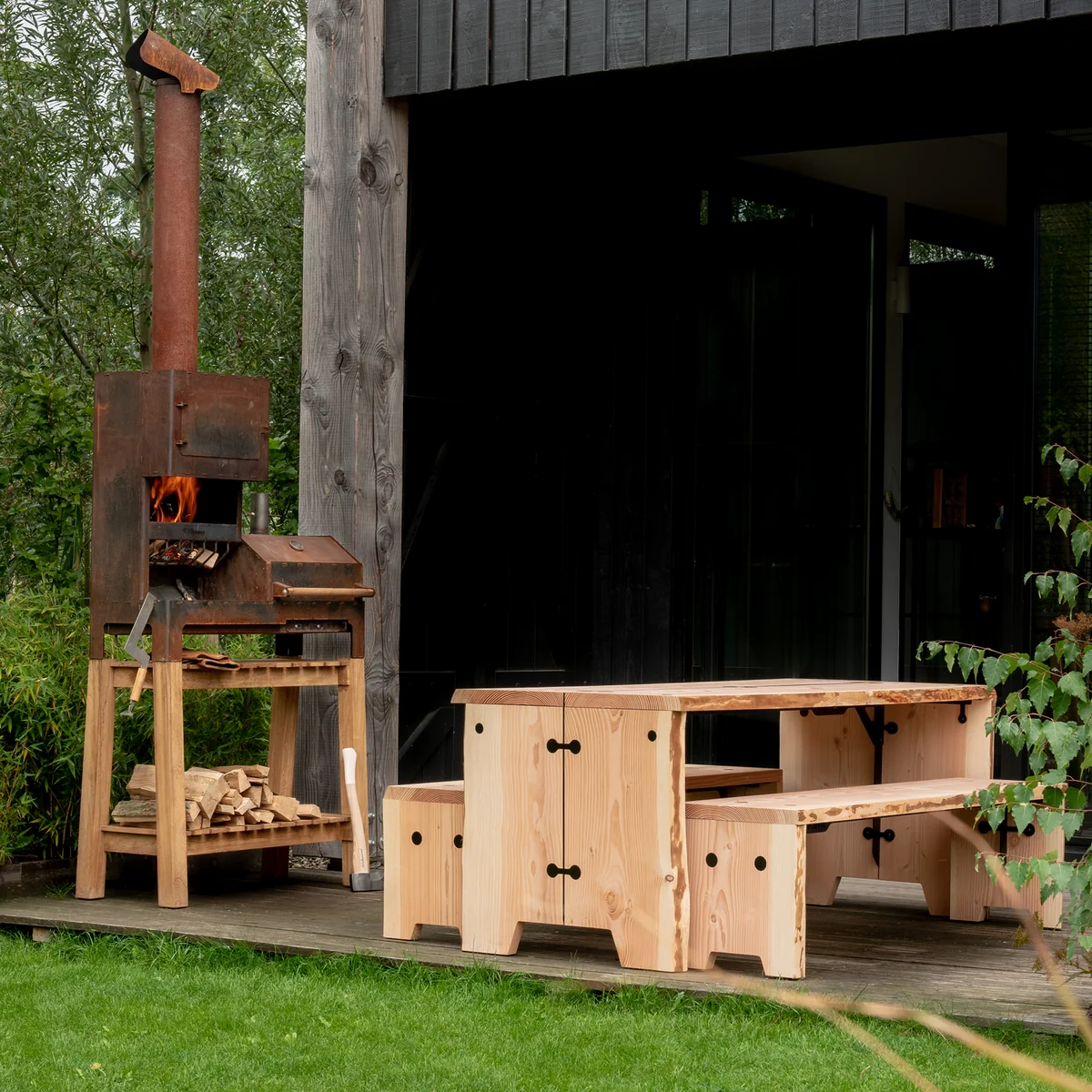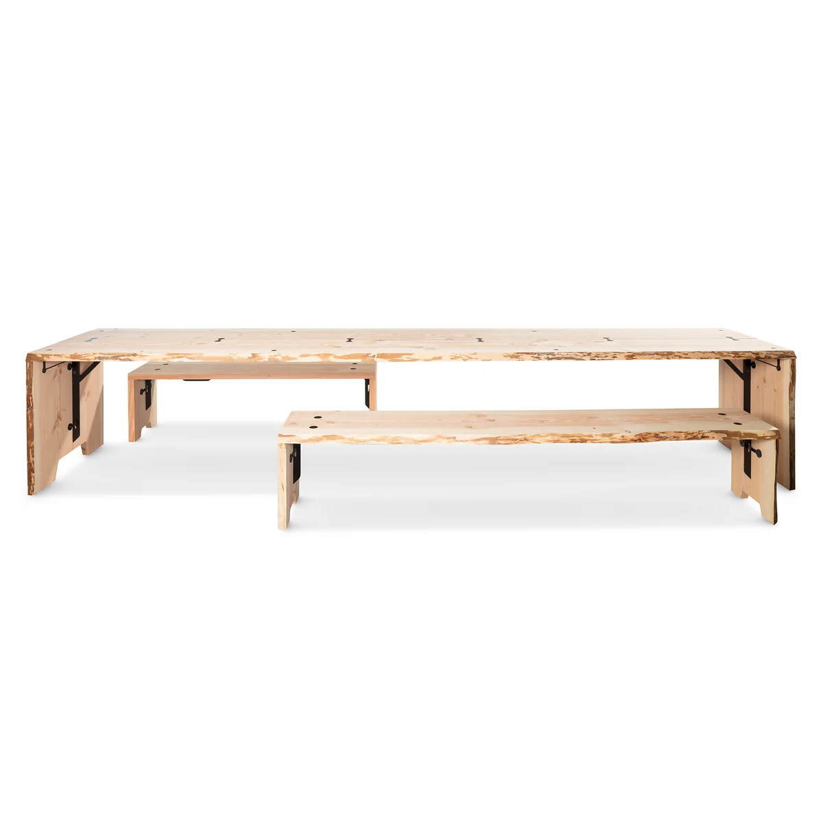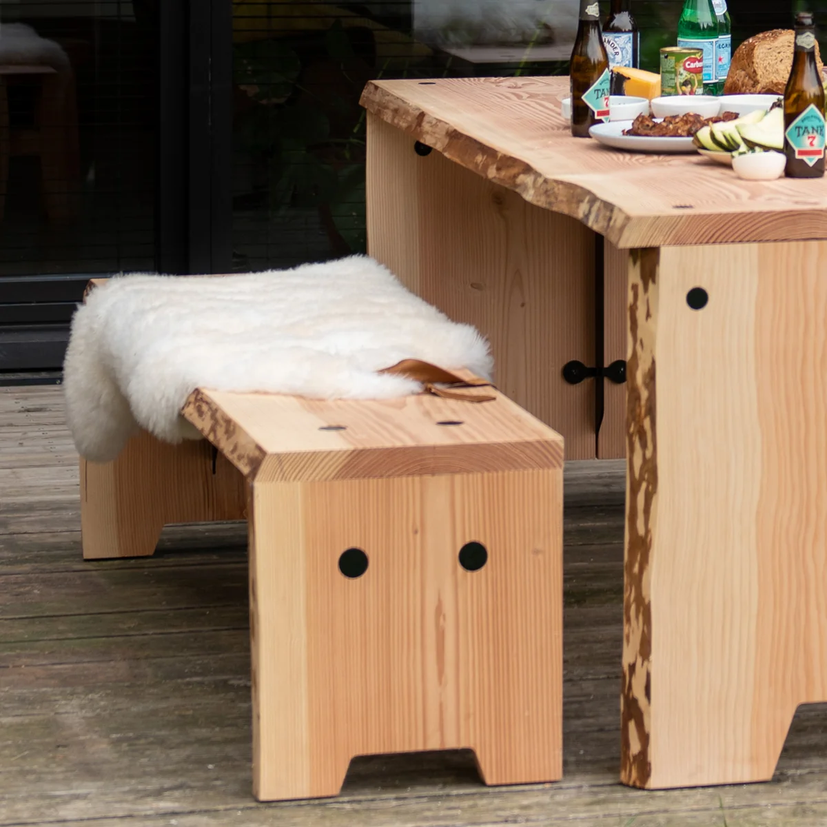 Ce banc est constitué de trois panneaux de bois de sapin de Douglas maintenus en forme par des joints en acier galvanisé et peint par poudrage. Les bords naturels des panneaux de bois ont été préservés, ce qui permet à leur forme de suivre celle de l'arbre et même de montrer des signes de l'écorce originale. Le grain brut et naturel crée une atmosphère chaleureuse dans l'environnement - que ce soit sur la terrasse ou dans la salle à manger.