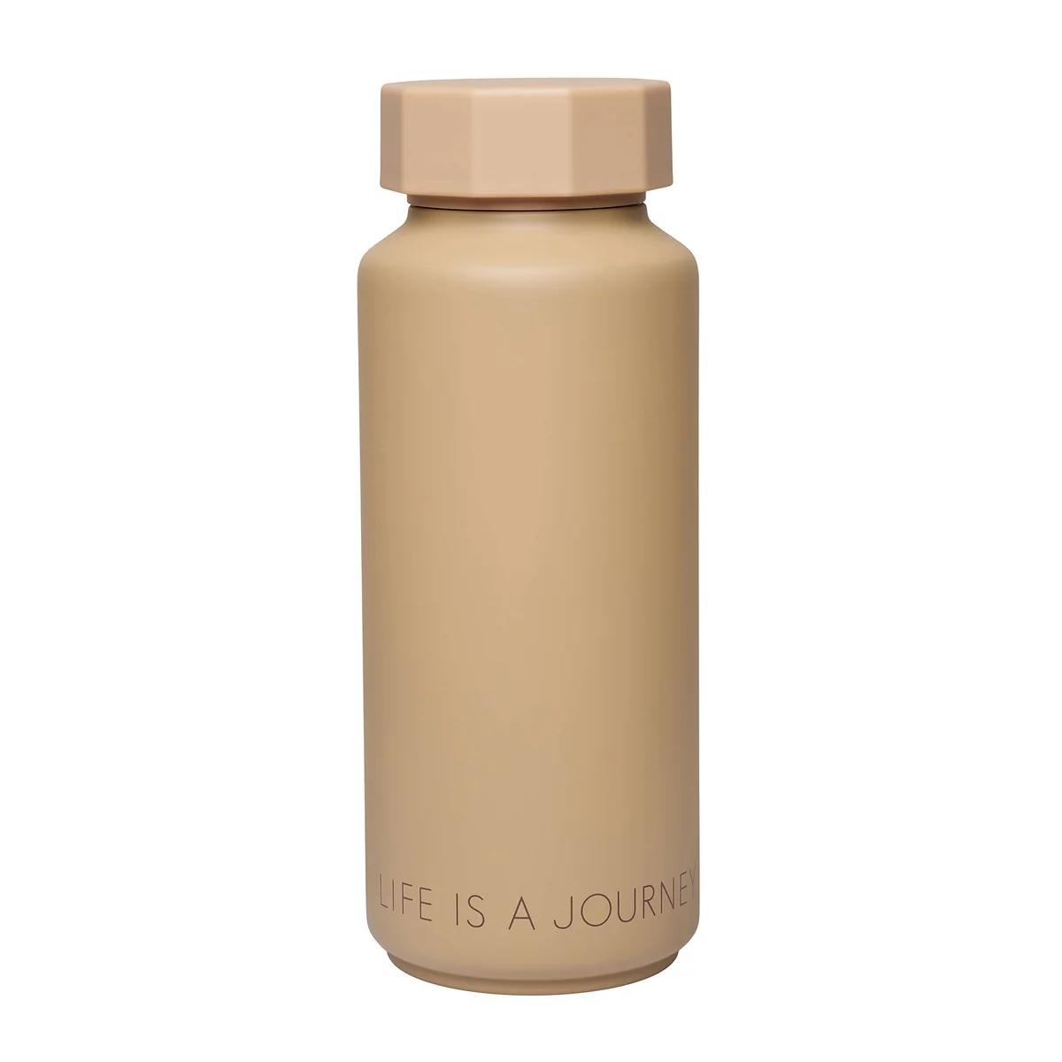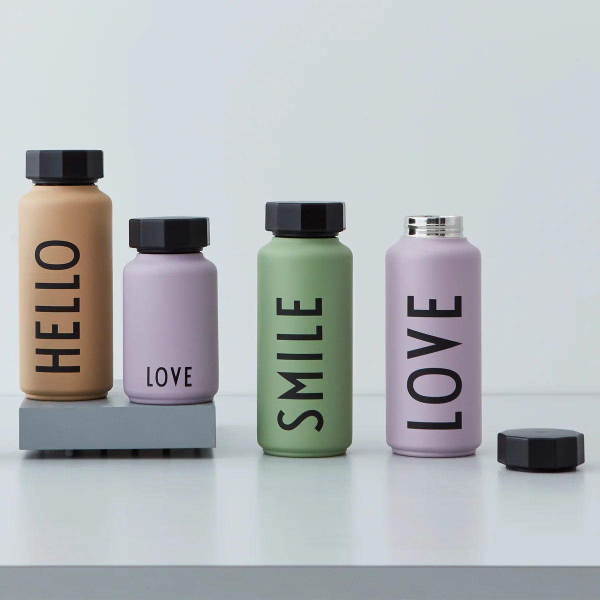 Le design de la bouteille thermos apparaît dans un look rétro stylé avec des inscriptions de différentes couleurs. La typographie est signée Arne Jacobsen et a été conçue dès 1937, à l'origine pour la signalisation de l'hôtel de ville d'Aarhus. Le design sans fioritures n'a rien perdu de son charme jusqu'à aujourd'hui et orne désormais de nombreux produits, notamment de Design Letters .