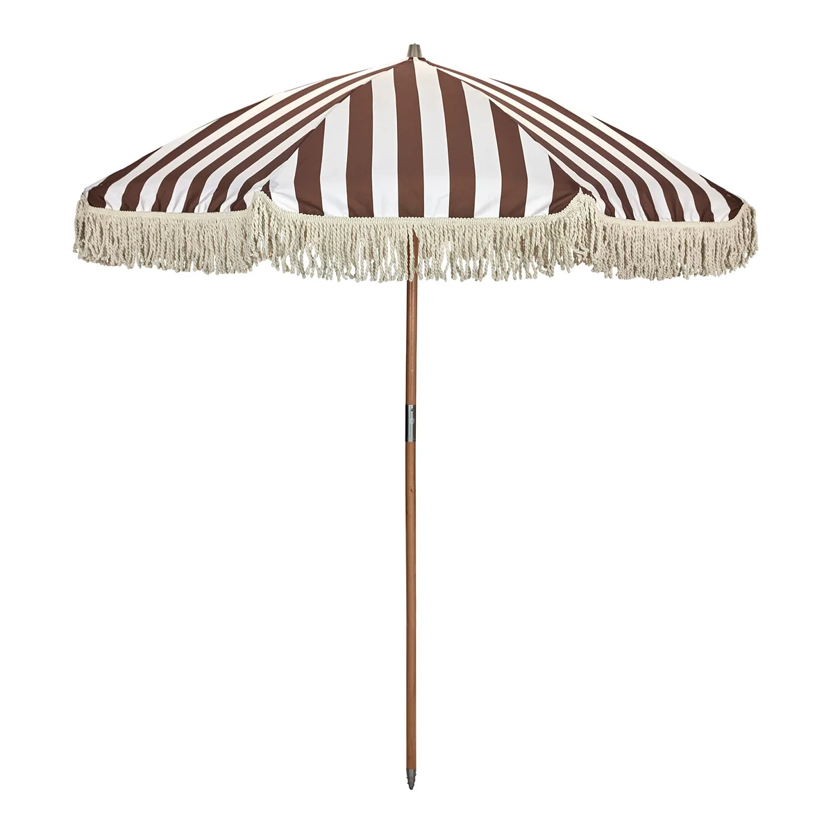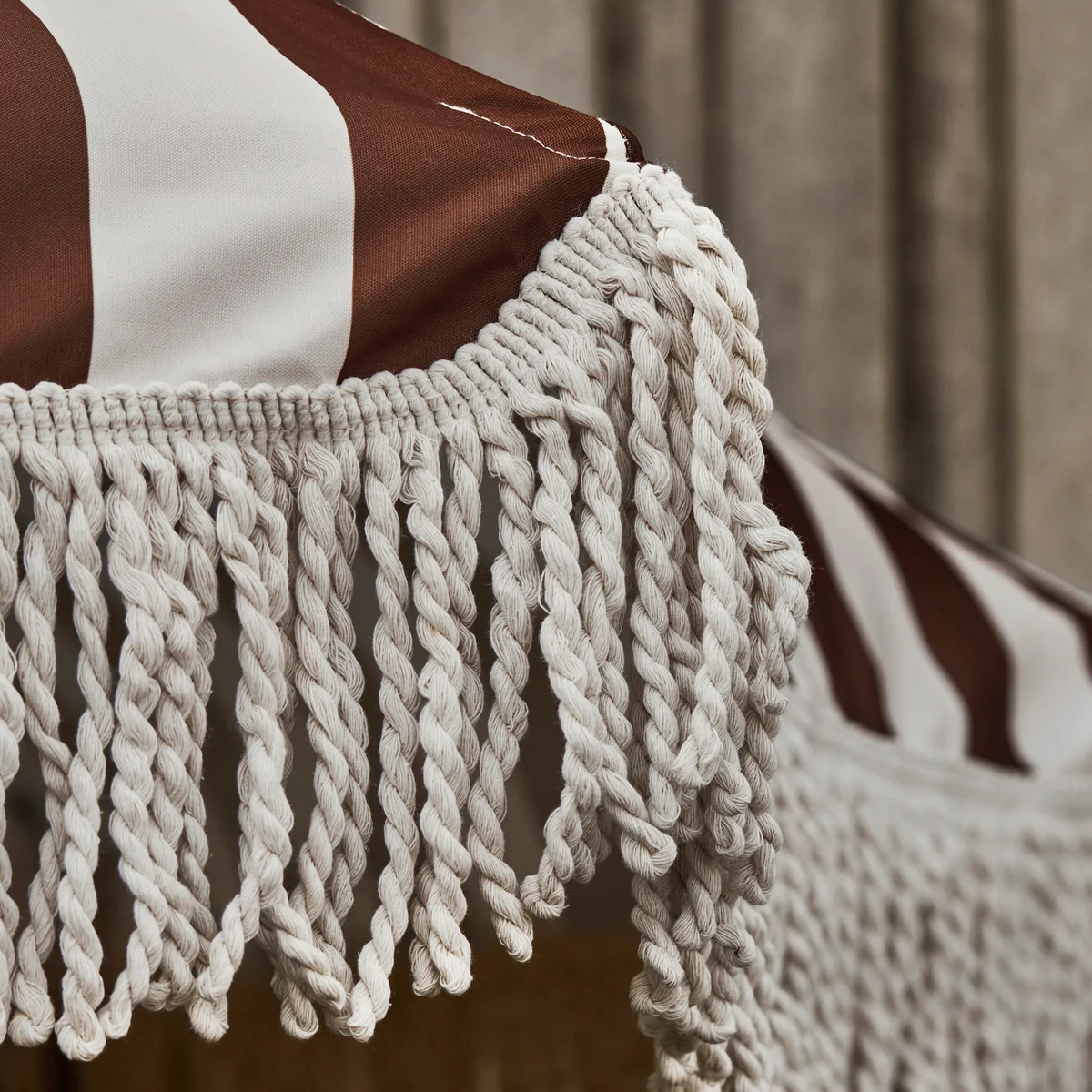 Cet élégant parasol n'offre pas seulement une protection fonctionnelle contre le soleil, il apporte également une touche de style à votre espace extérieur. Les larges rayures marron et blanc crème lui confèrent un aspect intemporel, tandis que les franges ajoutent une touche de charme rétro. Idéal pour le jardin, le balcon ou la plage, il allie design et praticité.
