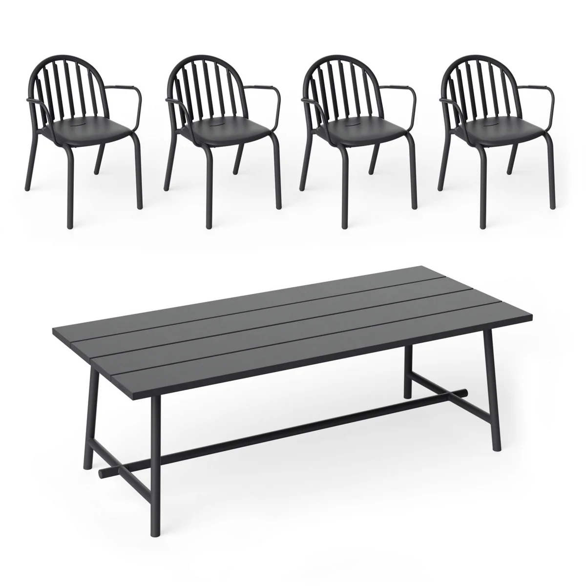La table Fred's Outdoor 220 x 100 cm en set avec la chaise à accoudoirs (set de 4) de la maison Fatboy disponible dans la boutique Connox Design !