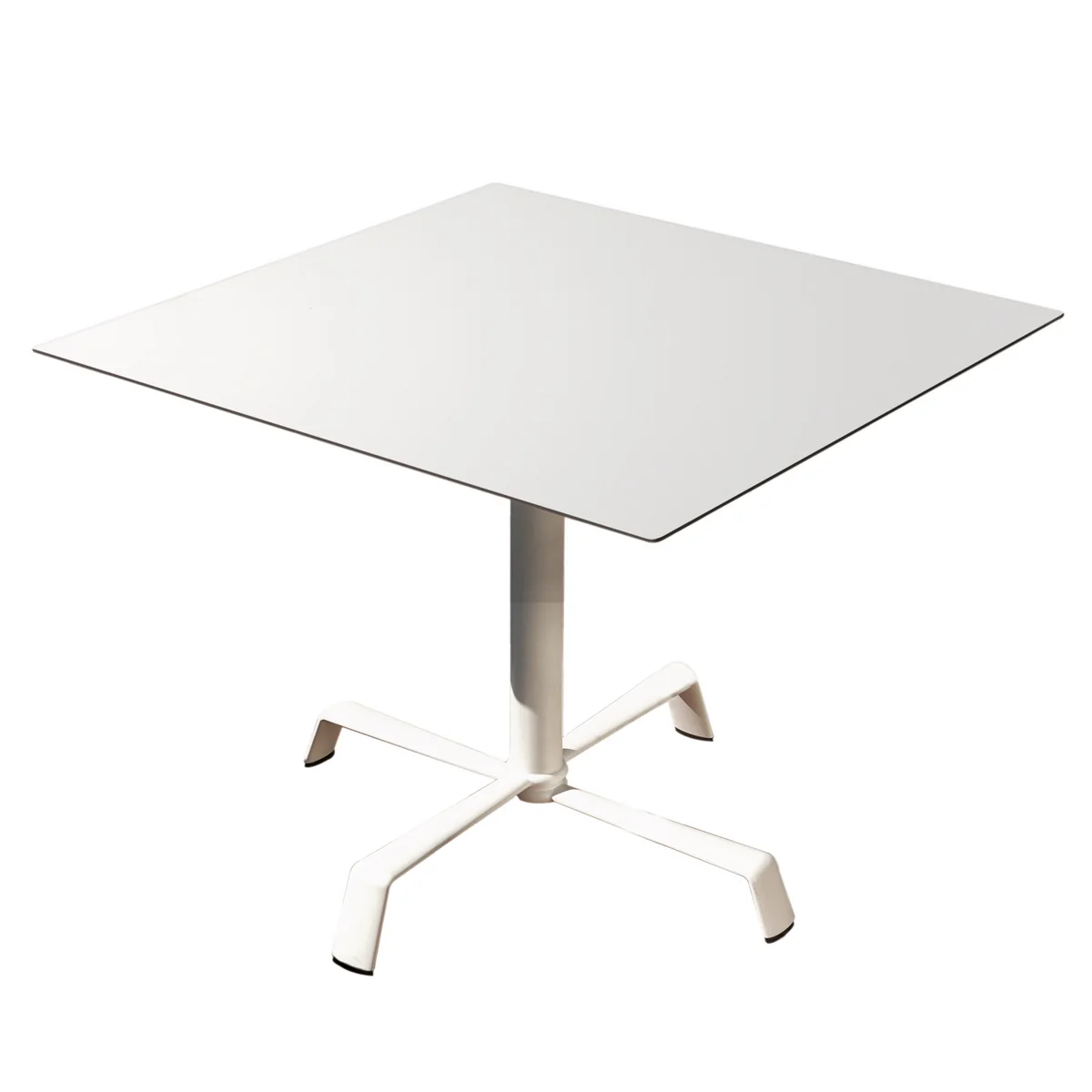 Le plateau de table et les pieds en forme de croix sont en aluminium thermolaqué et sont disponibles dans de nombreuses couleurs différentes. Ceux qui la préfèrent plus subtile peuvent choisir entre des couleurs telles que le blanc, le taupe ou le bleu pastel, mais d'autres variantes sont également disponibles sur demande.
