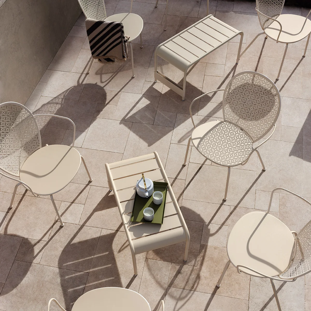 Les autres pièces de la collection Luxembourg sont elles aussi disponibles, comme le banc avec ou sans dossier, une table carrée et une table rectangulaire, un fauteuil bas, un support à roulettes et un appuie-tête. Tous les produits sont disponibles dans l'ensemble des couleurs proposées par Fermob.