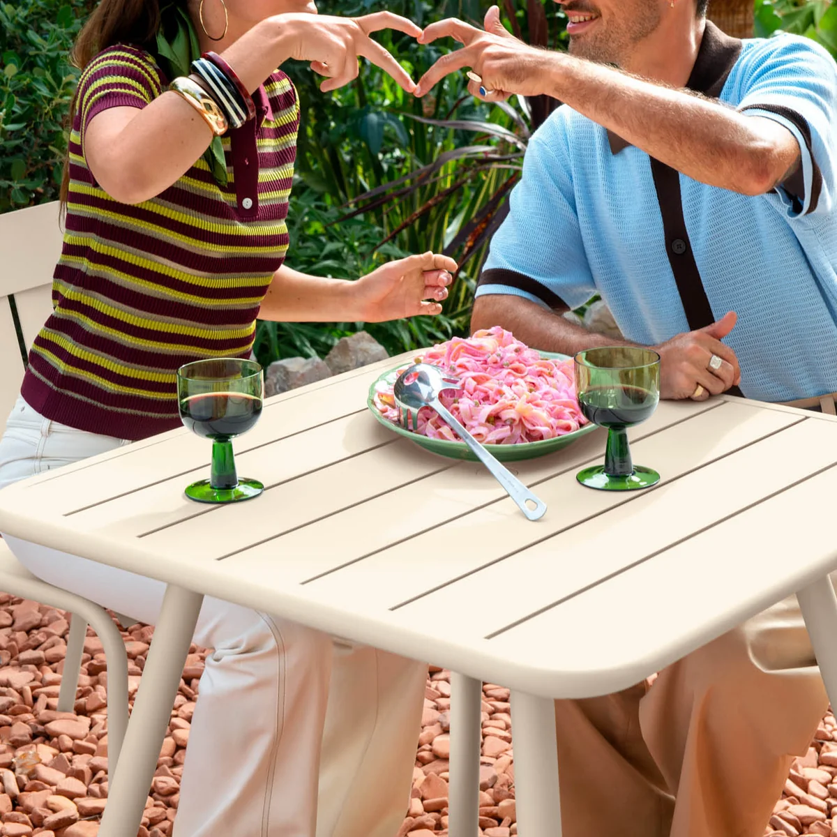 La place Luxembourg La table est idéale pour se réunir lors des douces soirées d'été entre amis ou en famille. La table de jardin carrée de Fermob est robuste et spacieuse, mais étonnamment lumineuse. Avec ses dimensions de 80 x 80 cm et ses quatre pieds, c'est une petite table pratique qui peut accueillir confortablement jusqu'à quatre personnes.