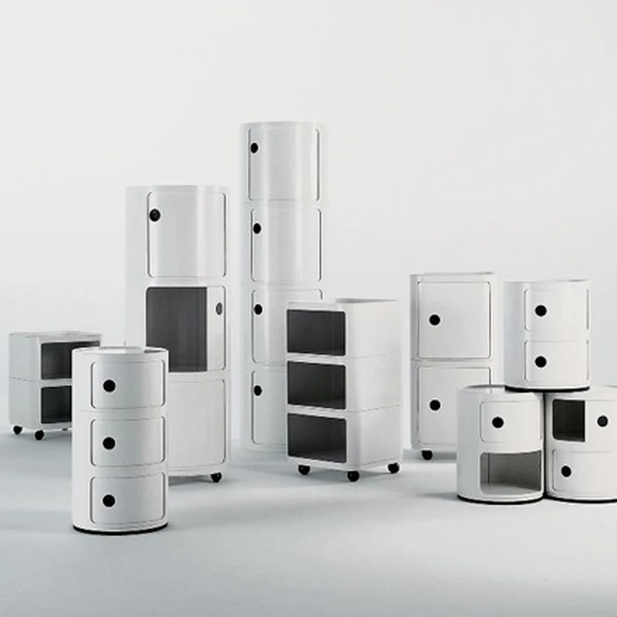 Les Componibili existent en version ronde ou carrée et peuvent également être livrés sur roulettes. Flexible, fonctionnel, pratique : les Componibili sont un classique du design avec une longue tradition, qui a obtenu beaucoup de reconnaissance pour la concision et l'innovation de son design et qui a depuis longtemps roulé dans l'exposition permanente du Museum of Modern Art de New York et du Centre George Pompidou à Paris.
