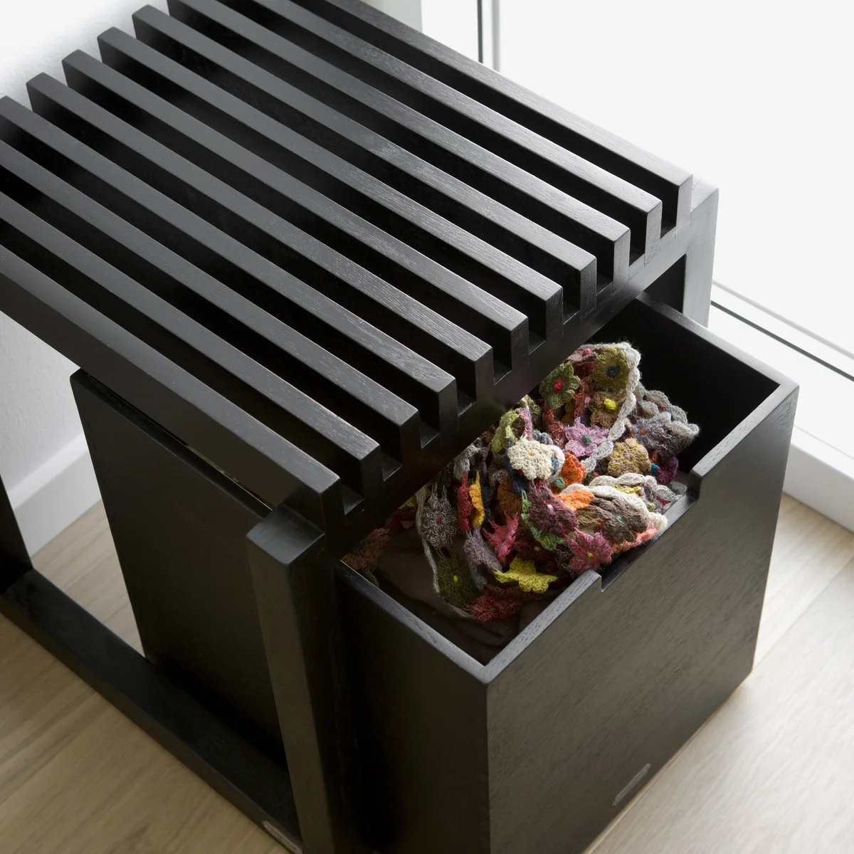La petite version de la Cutter Box possède des pieds, tandis que la grande version est équipée de roulettes : elles font en sorte que la caisse scandinave soit parfaitement adaptée pour être placée sous le Cutter banc, de la Cutter La caisse peut être rangée dans le coffre d'une chaise ou d'un autre meuble et ressortie en un tour de main.