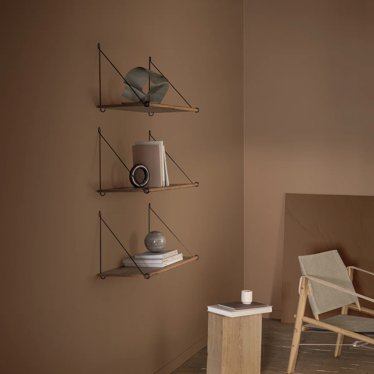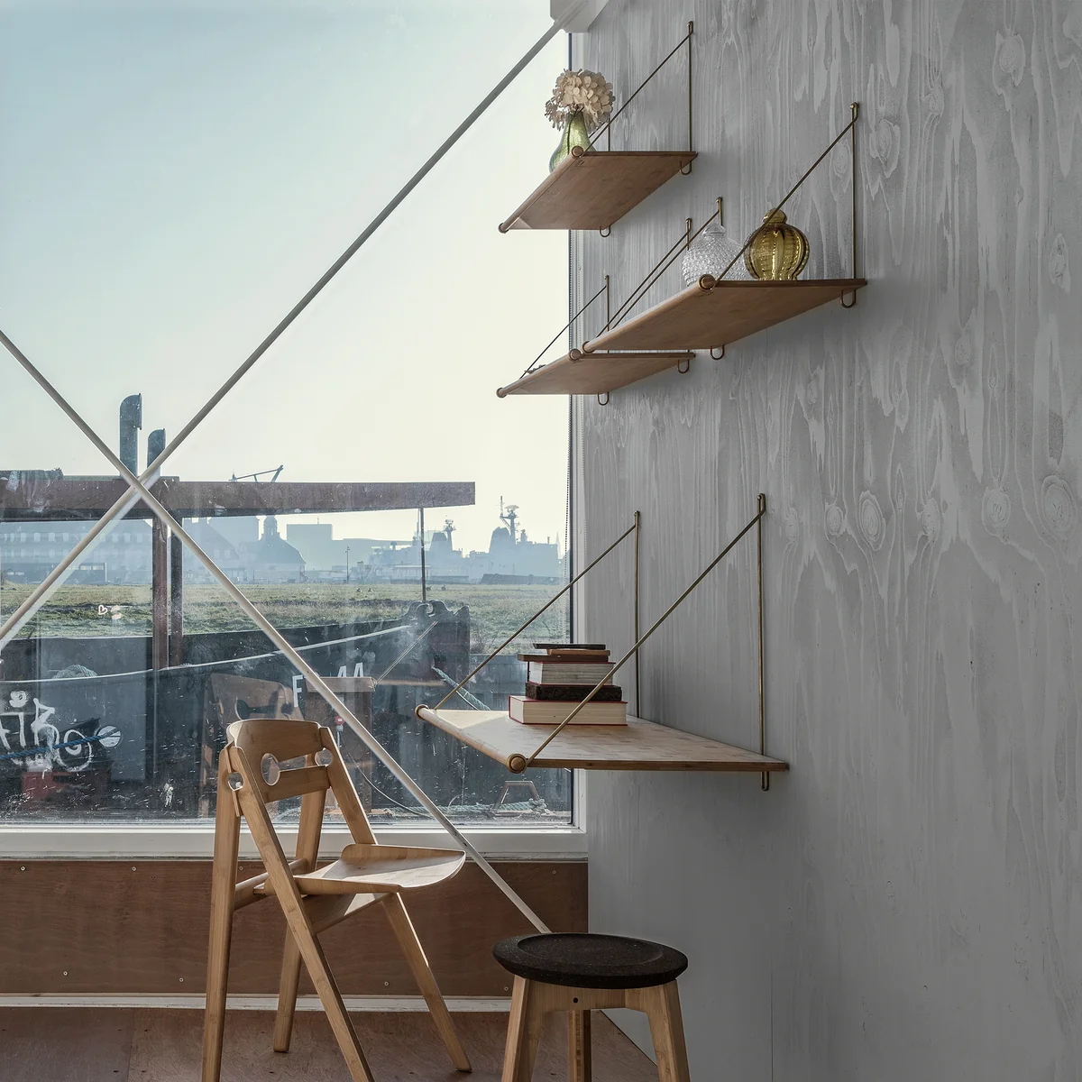 Les supports métalliques en forme de boucle spécialement conçus sont montés directement sur l'étagère, créant ainsi un meuble à la fois léger et exceptionnellement solide. L'intention de Jørgensen était de redessiner l'étagère traditionnelle et de lui donner plus de forme et de fonction.