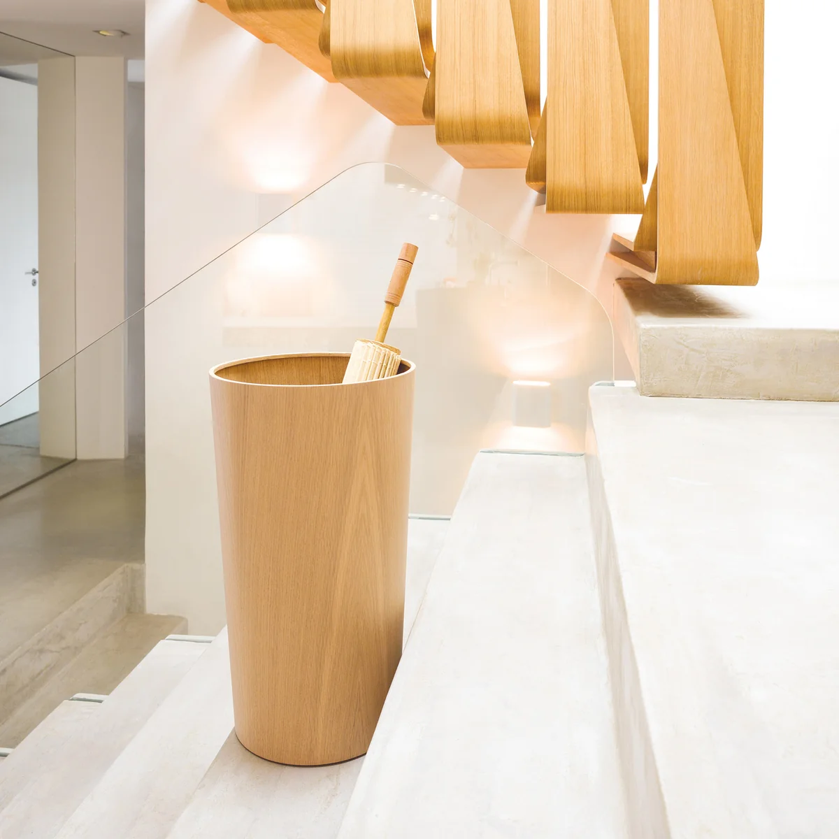 Le porte-parapluies 0514 de Schönbuch est un contenant rond en bois, qui apporte une atmosphère chaleureuse et accueillante dans l'entrée. Placé directement près de la porte d'entrée, il évite de ramener l'humidité dans les pièces et devient un accroche-regard esthétique et raffiné dès que l'on pénètre dans la maison.