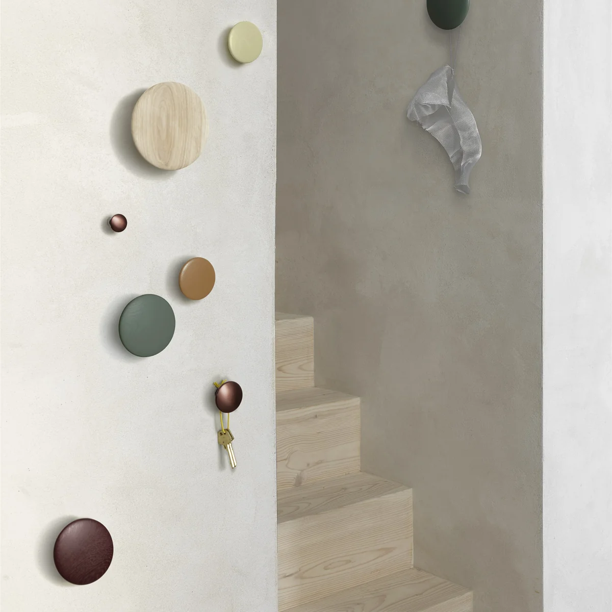 Les Muuto-Dots sont particulièrement efficaces dans l'ensemble arrangé individuellement sur le mur, que ce soit en grand, moyen ou petit. Les crochets muraux sont disponibles à l'unité ou par lot de 5, en bois ou en métal de haute qualité. Ils sont disponibles en version Small, Medium et Large.