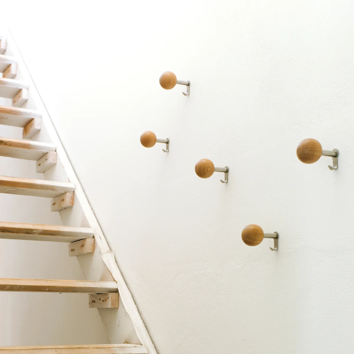 La boule de Dots est en bois massif, laqué brillant ou huilé naturellement. La tige de quatre centimètres de long et le disque mural sont fabriqués en acier inoxydable brossé, le matériel de fixation pour l'auto-assemblage est fourni.
