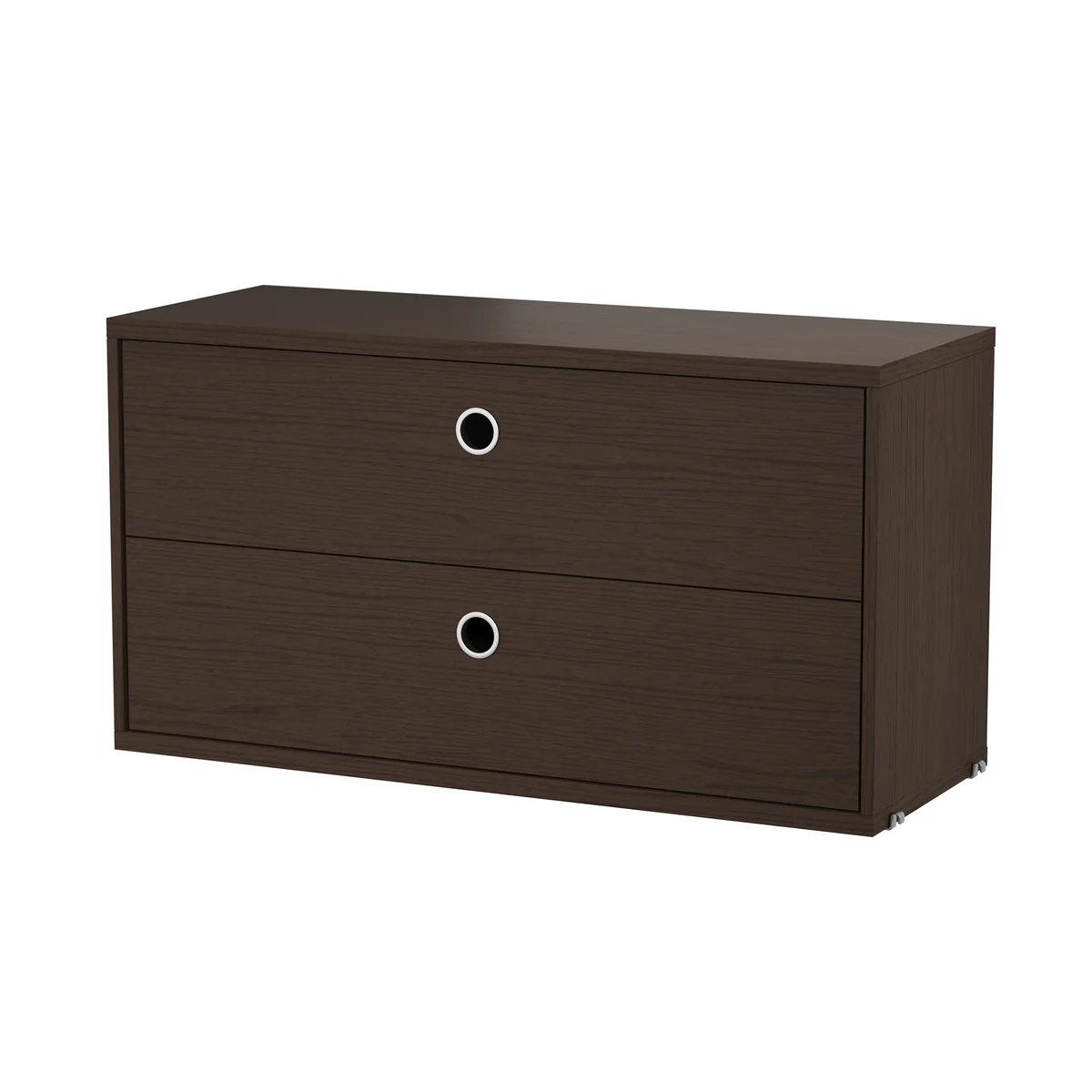 Le module d'armoire avec tiroirs de String permet au système d'étagères de devenir une armoire organisée et les objets qui ne doivent pas être immédiatement visibles peuvent disparaître discrètement dans les tiroirs du module. En outre, la partie supérieure de l'armoire sert également de surface de rangement.