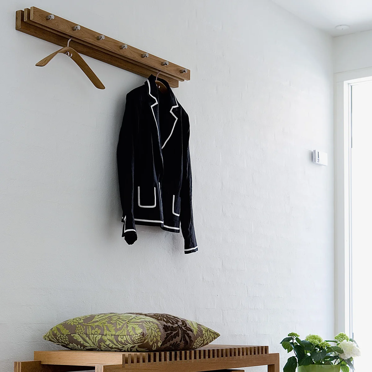 Le Pilot Le cintre de la designer Nina Tolstrup est disponible en teck et en chêne. En raison notamment de son matériau, le Pilot Le cintre est un complément idéal à la série de garde-robes Cutter de Skagerak.