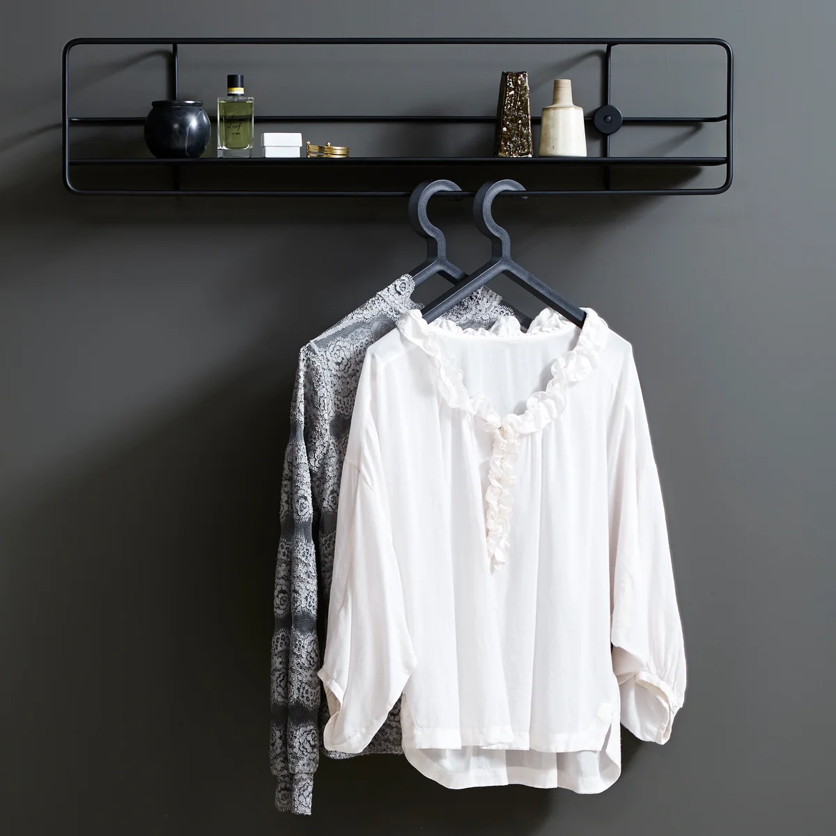 Illusion Hanger de Woud joue avec la perception et challenge l'œil. Les proportions et la forme du cintre ne sont pas perçues au premier regard, mais seulement lorsqu'il est suspendu à une tringle. Dès qu'il est accroché, il se balance doucement en position diagonale, ce qui permet de bien présenter les vêtements suspendus et de prendre moins de place sur la tringle.