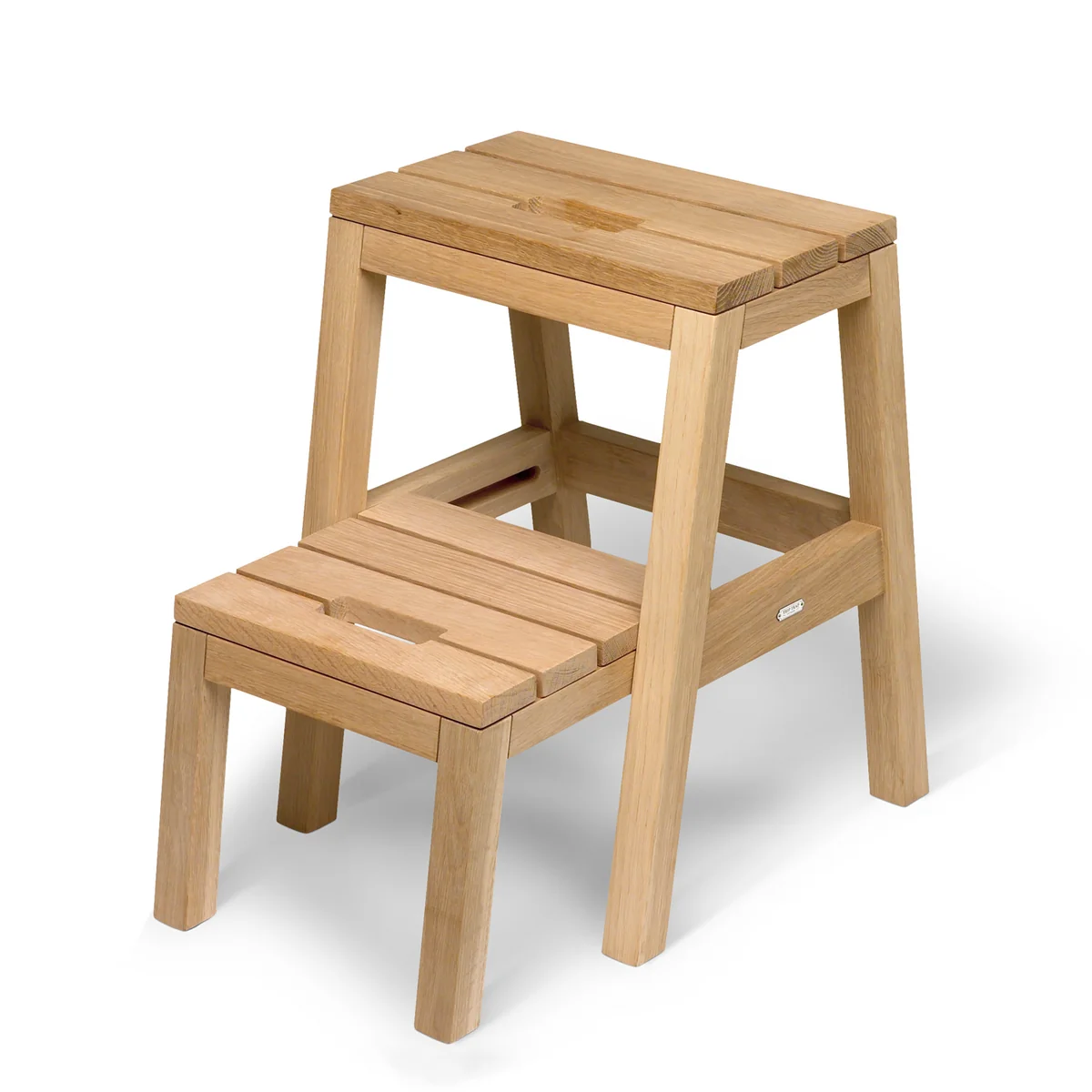Le design fonctionnel a été conçu par le bureau de design Designit. L'escabeau est fabriqué en bois massif de chêne ou de teck certifié FSC®.