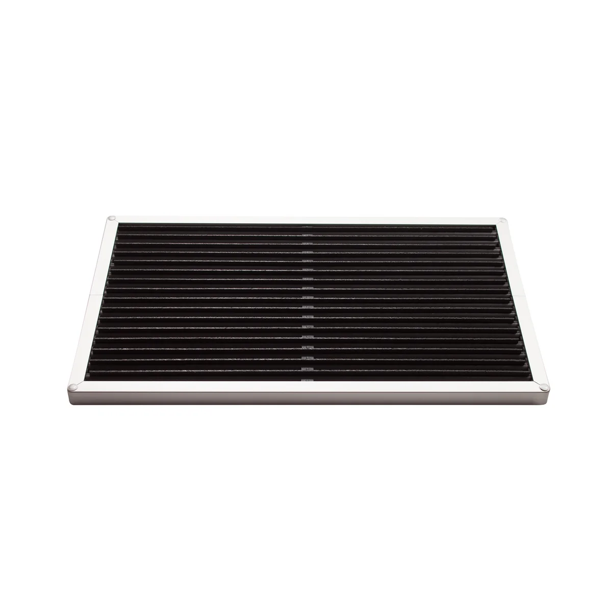 Le tapis antidérapant se compose d'un cadre en aluminium revêtu par poudre, d'un cadre intérieur en PVC extrudé et d'une bande d'acier inoxydable 304. Grâce à ses matériaux, le paillasson Rizz peut être placé aussi bien à l'intérieur qu'à l'extérieur.