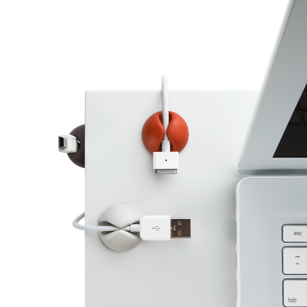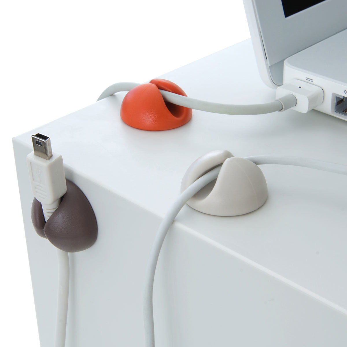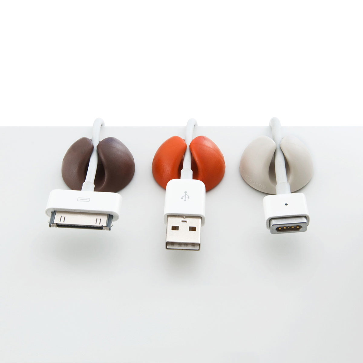 Fixez les CableDrops par Bluelounge derrière ou sur votre bureau, sur le mur ou partout où un câble doit être tenu pour un certain temps et afin qu’il puisse être facilement rallongé ou débranché.