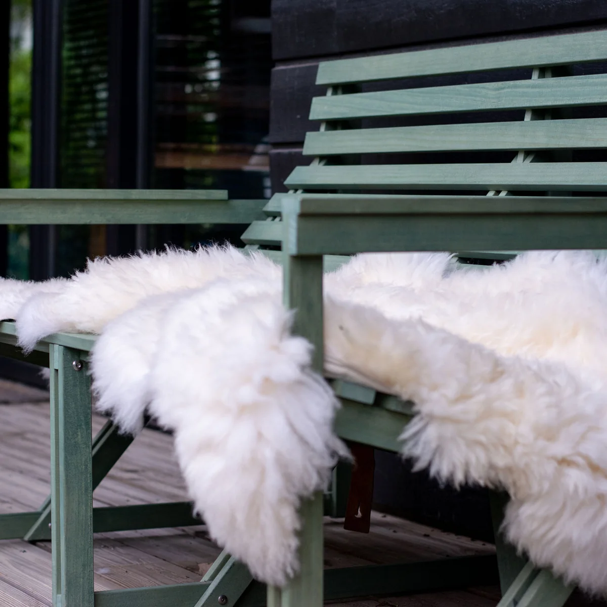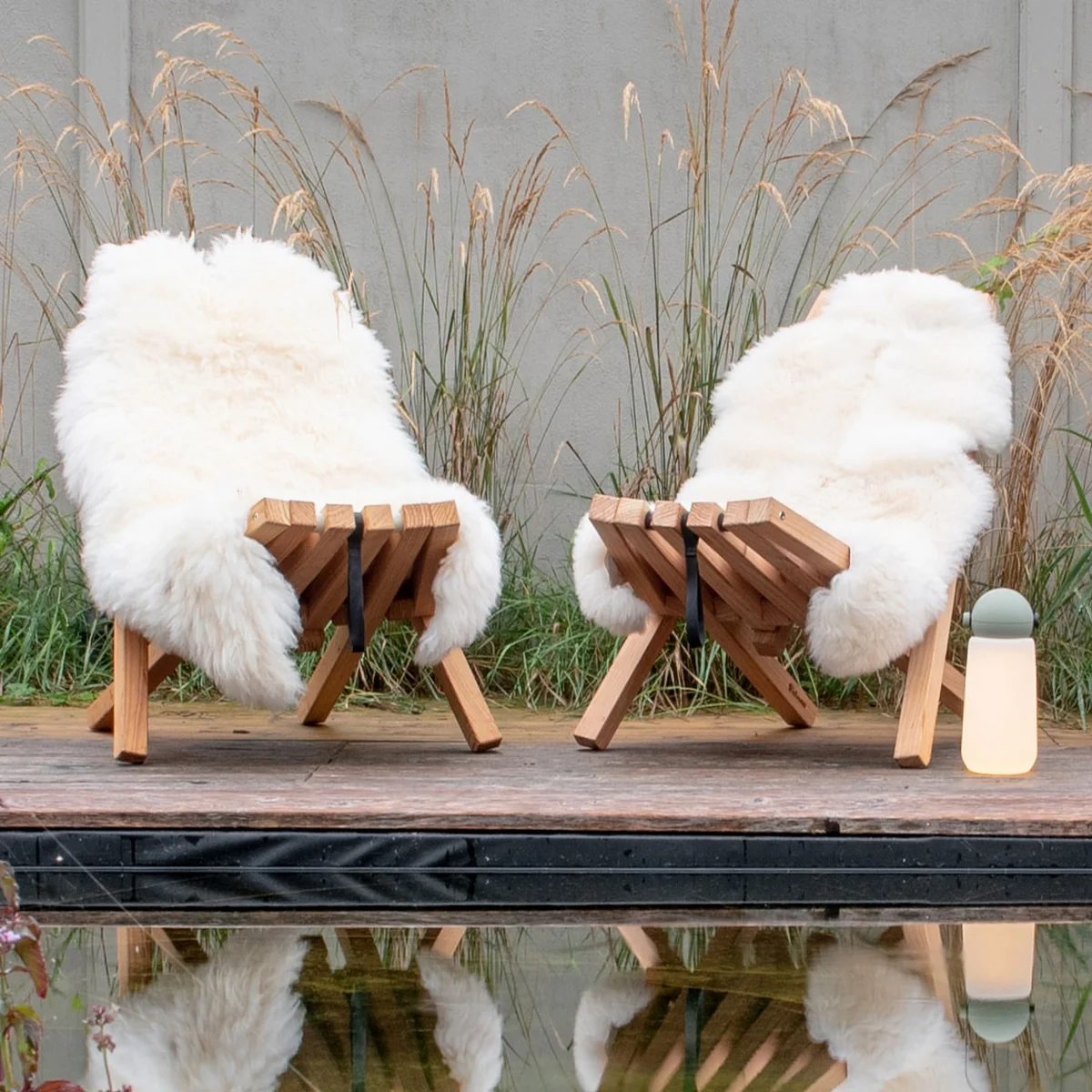 La peau de mouton de Weltevree crée une ambiance agréable à l'intérieur et à l'extérieur. Aménagée en tapis au sol ou en jetable posée sur la chaise de campagne et un banc, la fourrure apporte chaleur, bien-être et ambiance chaleureuse.
