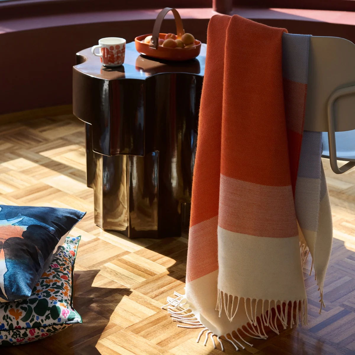 Ce plaid de qualité supérieure, composé d'un mélange de laine certifiée et de coton bio, allie matériaux naturels et design classique. Le motif Hennika, conçu par Vuokko Eskolin-Nurmesniemi, se caractérise par de grands champs de couleurs calmes et incarne l'esthétique intemporelle de Marimekko . La couverture douce et chaude est dotée de franges décoratives aux extrémités et porte le label Marimekko comme signe de qualité et de design.