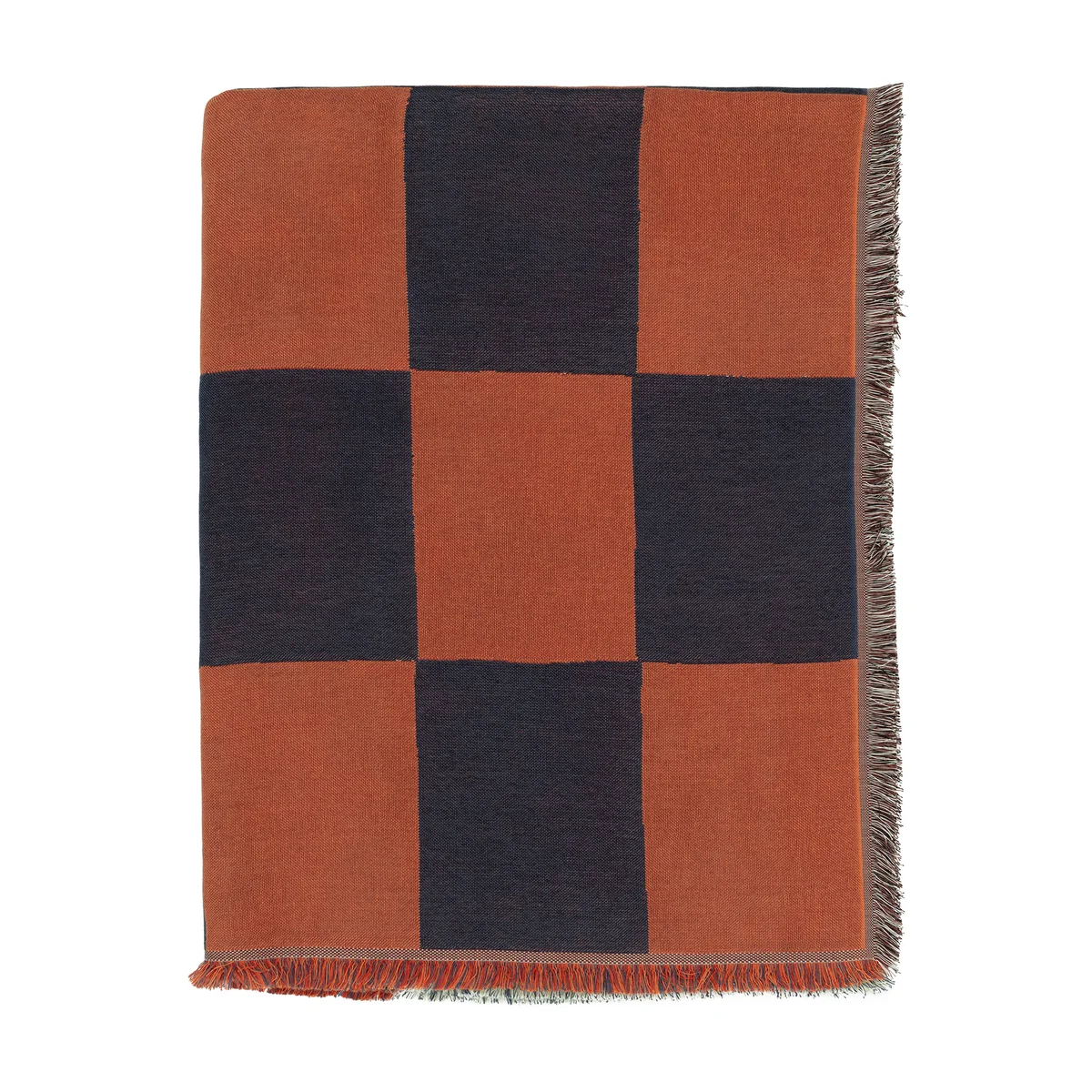 La couverture Kukko Ja Kana de Marimekko est fabriquée en coton bio selon la technique du tricot jacquard et comporte de courtes franges sur les côtés. Sur l'envers de la couverture, les couleurs du motif sont inversées.