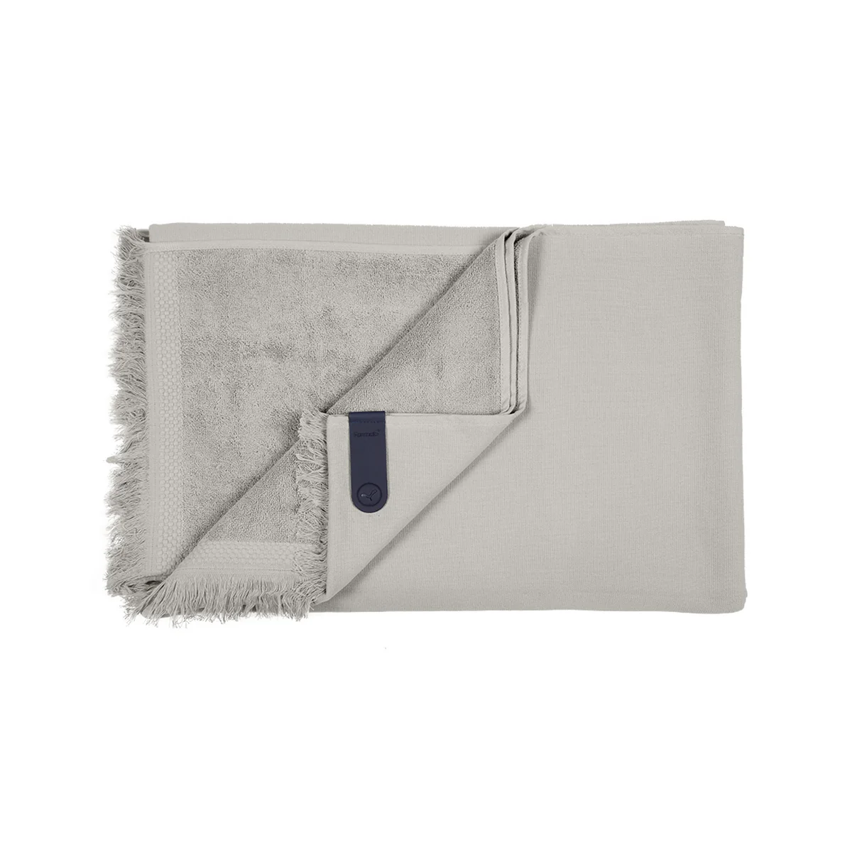 Fouta Le Fermob se distingue des autres serviettes par ses franges, grâce auxquelles il peut également être utilisé comme jeté sur un canapé. Un détail particulier est la bande de fermeture typique de Fermob sur le bord.