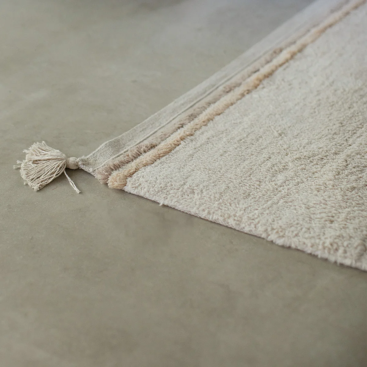 Le tapis Bloom Natural tapis de la maison Lorena Canals séduit par son toucher extrêmement moelleux et son aspect noble. Le tapis à glands de style bohème est fabriqué à partir d'une base RugCycled®. Bloom Natural offre une merveilleuse touche de neutralité sans être envahissante.