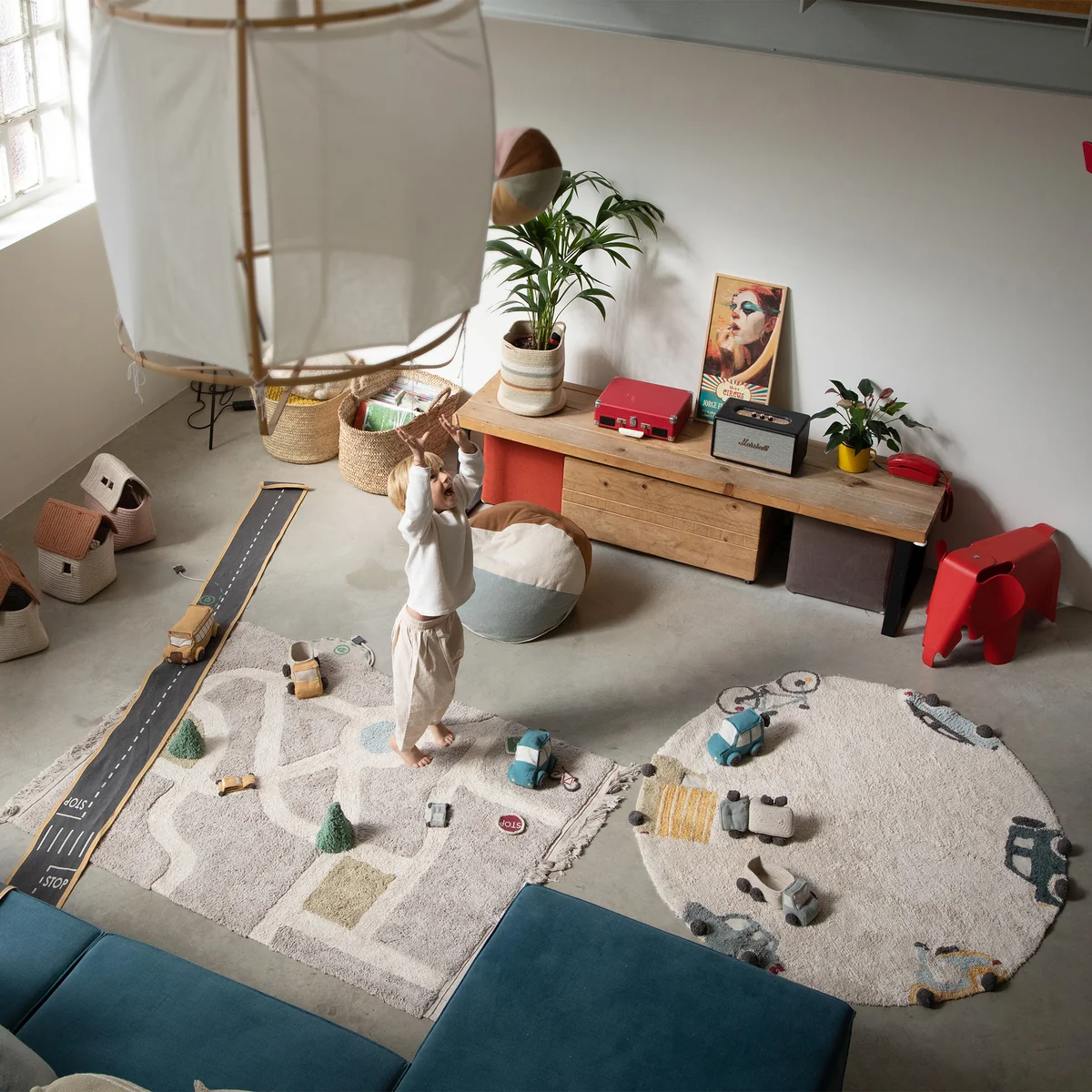 Le Wheels tapis de la maison Lorena Canals offre un maximum de plaisir dans l'éco-ville. Les plus petits membres de la famille peuvent laisser libre cours à leur imagination. Le tapis avec des véhicules électriques et des vélos peut être merveilleusement placé et transporté dans toute la maison. Wheels est fabriqué à partir d'une base de coton avec des fibres textiles recyclées.