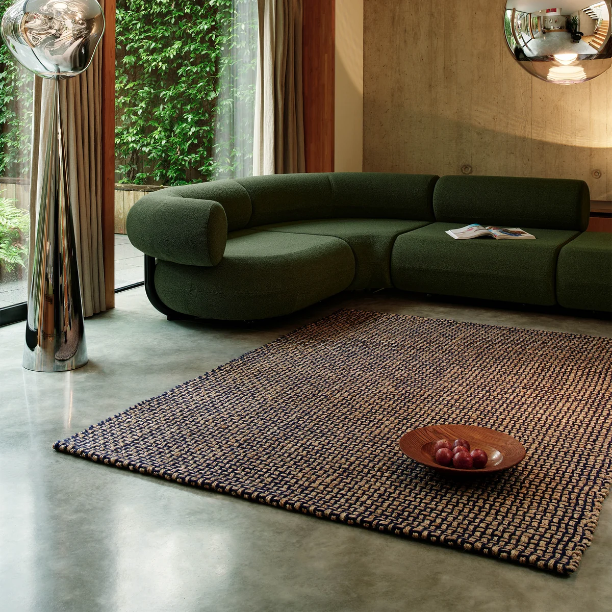 Le tapis Weave réinterprète le motif tressé classique et lui confère une note moderne grâce à des structures agrandies et des contours clairs. Fabriqué à partir d'un mélange équilibré de jute et de laine, le tapis combine une robustesse naturelle et une douceur agréable. Le fil de jute torsadé donne un aspect organique, semblable à celui du bois, tandis que la laine apporte confort et chaleur.